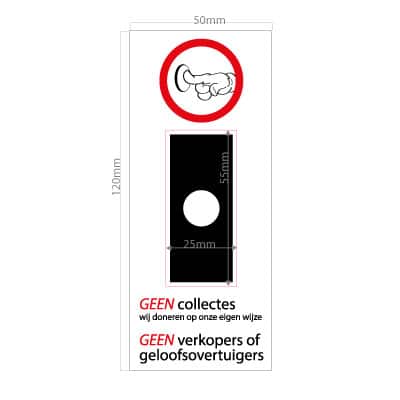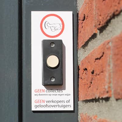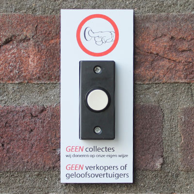 GEEN verkoop aan de deur bordje (ook wel Bel Niet Aan bordje genoemd), tegen ongewenste colportage (en eventueel collectes) aan de deur.